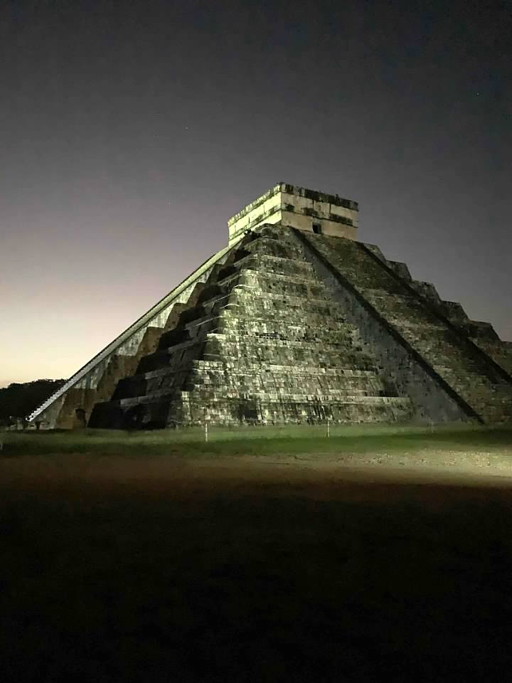 On a recent trip, we entered Chichen Itza, the most famous Mayan ruins in Yucatan, at 5 A.M. We were there to watch the sun rise over the famous pyramid and other structures. It was still dark in the east, but it was not completely dark. A full moon hung low in the west, giving a lovely glow to the setting. However, it was dim enough for our guide to hold a light pointing at the edge of the pyramid to mimic the sun’s rise at the equinox. The head of a serpent’s head is carved at the bottom of the structure’s steps, and the shadow cast by the guide’s light, and by the sun at the change of the seasons, resembles the lengthy body of a serpent culminating at the carved head. The Mayans knew the placement of the heavenly objects, and the pyramid was carefully constructed to commemorate the snake the Mayans revered.