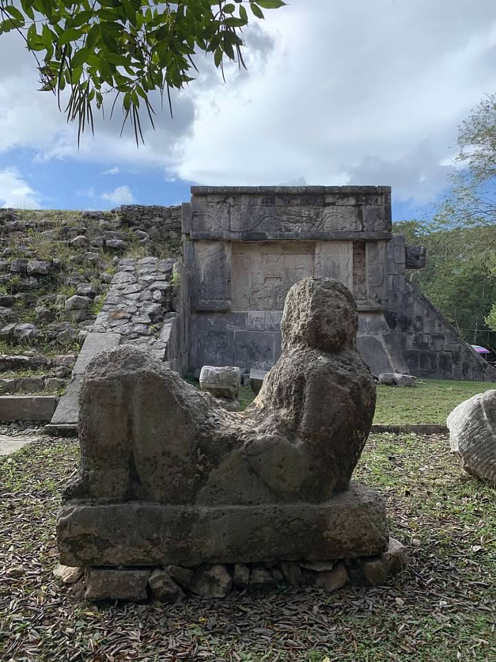 Chak mool is a statue of a reclining man leaning on his elbows with the head turned ninety degrees, I think always to the right. A plate or bowl is on the stomach of the man. And just as Chichen Itza has more than one ball court, it contains several chak mool statues.