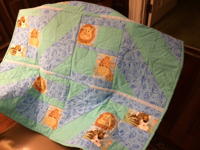 Making a baby quilt is similar. There are a hundred ways to make a mistake, of course, but given basic competence, the result of the piecing and measuring and assembling, the colorful fabrics, the animal smiles, even the jumble of pieces almost always make a satisfying bouquet.